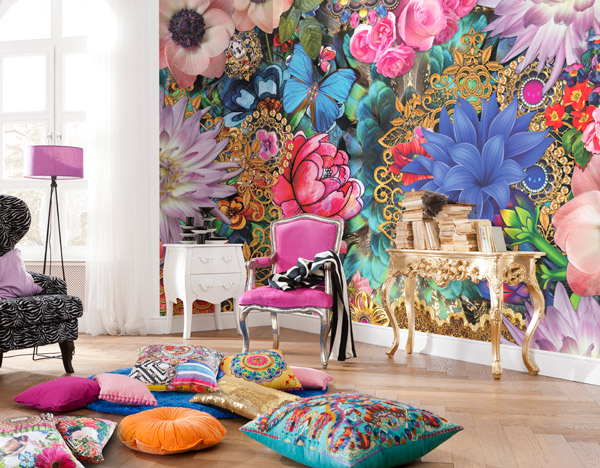 Etiquetas: fotomural Komar, mural Melli Mello, fotomural gran colorido, mural grandes flores, fotomural flores llamativos colores, mural atrevido flores con marcos dorados, fotomural flores con adornos dorados