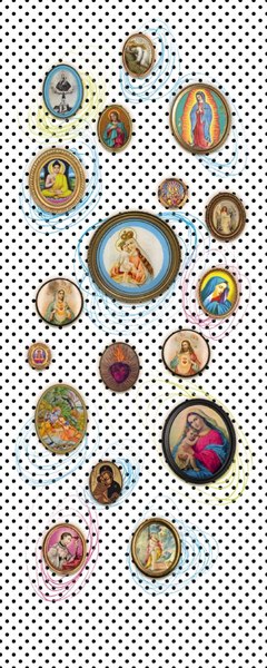 Descripción del producto: Fotomural en fondo blanco con lunares en negro y imágenes religiosas sobrepuestas.