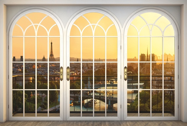 Descripción del producto: Fotomural de un gran ventanal compuesto pos tres puertas con cierta apariencia romántica y clásica y con la ciudad de París y algunos de los lugares más emblemáticos de fondo.